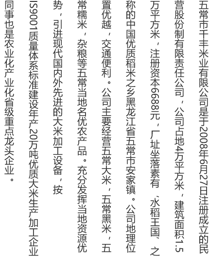 五常市千豐米業(yè)有限公司是于2008年6月27日注冊(cè)成立的民營股份制有限責(zé)任公司